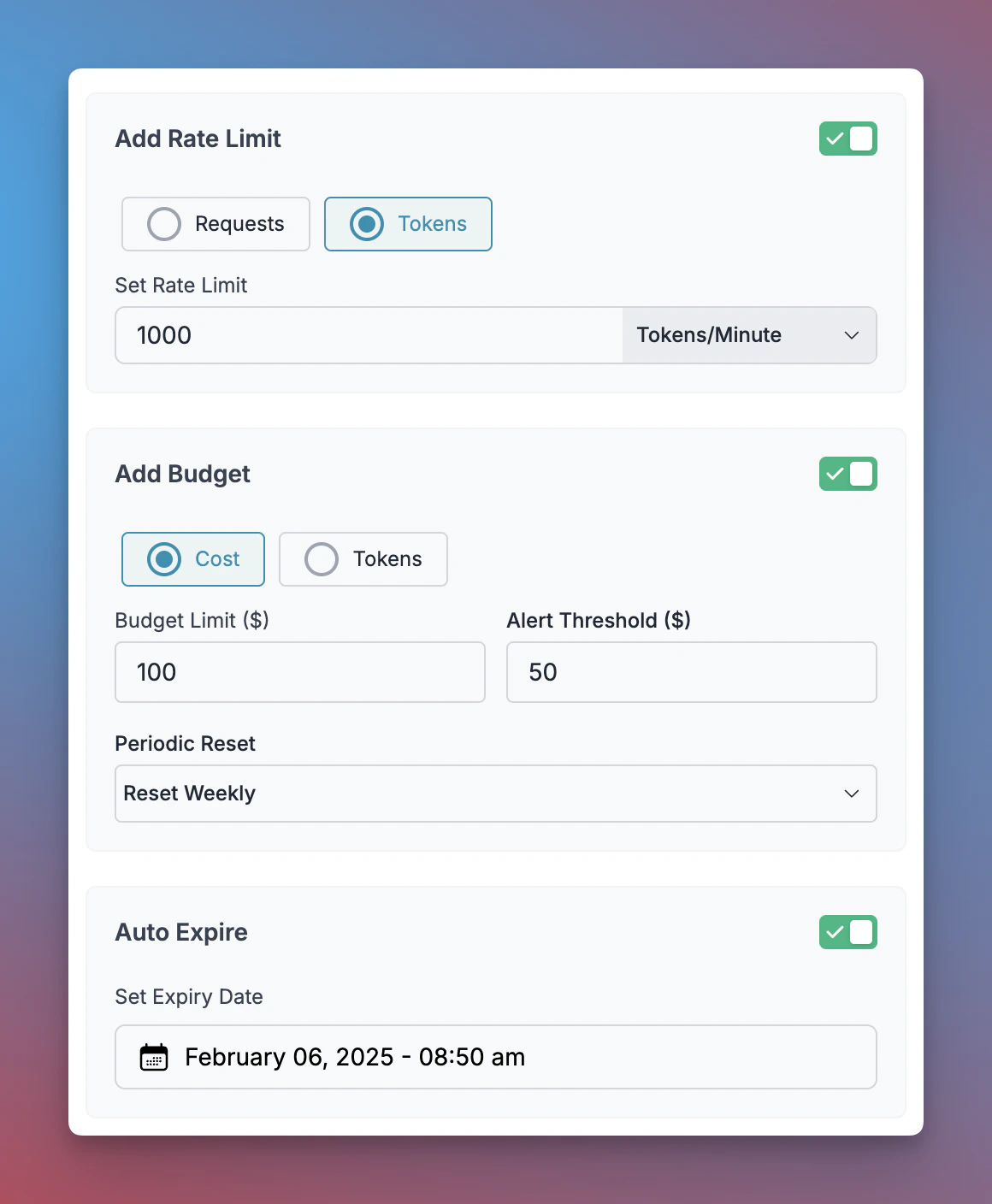 We’re introducing comprehensive usage controls for both Virtual Keys and API Keys, giving platform teams precise control over LLM access and resource consumption. This release introduces: